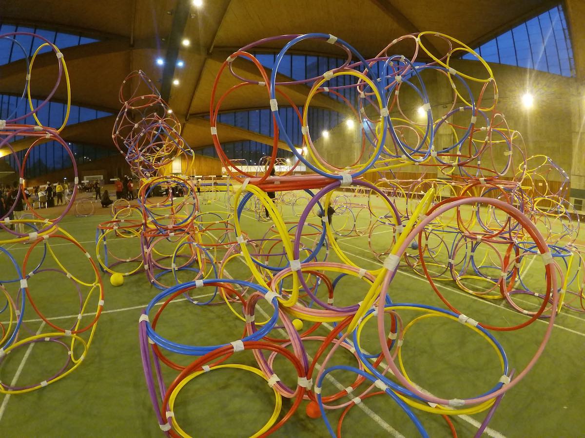 Depuis les années 1960, ces architectures modulaires, ou Space Chains, peuvent se développer à l’infini, selon un protocole souple d’improvisation. Réalisée par l’architecte et humaniste Yona Friedman, la structure inédite du Musée Sans Bâtiment conçue pour la Nuit Blanche 2019 dans sa version « iconostase » consiste en l’assemblage participatif de 800 cercles de hula hoops, disposés sous forme de modules, au sein de la magnifique pagode du Centre Sportif Jules Ladoumègue à Paris.