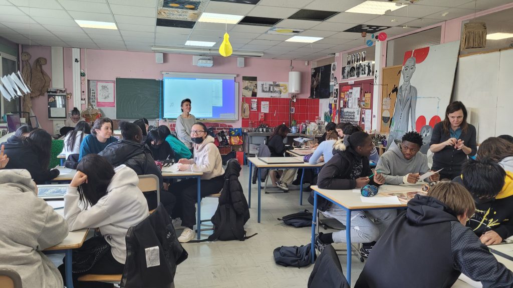 Les interventions se font sur l’ensemble de l’Île-de-France ainsi qu’en Normandie, à destination des publics scolaires en priorité et des partenariats établis — notamment avec la Région Île-de-France. Ce format repose sur un projet dont l’artiste sélectionné·e est le principal concepteur, en raison de ses compétences et en relation avec son travail artistique. Le projet se construit autour d’une diffusion de la collection des Multiples du Cneai.Les retours des établissements rencontrés en 2023 sont très bons, et il semble nécessaire pour les élèves en formation. Ces projets sont fédérateurs et souvent déterminants dans leur parcours, d’après les retours des équipes enseignantes. Dans certaines filières professionnelles enseignant des savoir-faire manuels, les projets menés par le Cneai permettent de découvrir l’apprentissage des métiers sous un autre angle et s’intègrent pleinement dans le cursus scolaire.