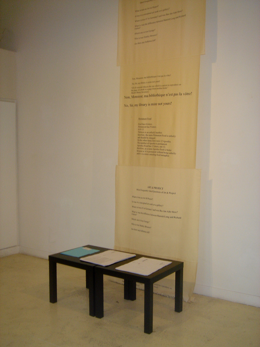 Le collectif new-yorkais Continuous Project, fondé en 2003, présente une sélection de ses imprimés incluant des fac-similés de magazines, un projet de réédition des poèmes de Muammar Qaddafi, ainsi que de nouveaux bulletins réalisés sur le modèle de Art & Project (consacrés notamment à Allen Ruppersberg, Kelley Walker et Aleksandra Mir).