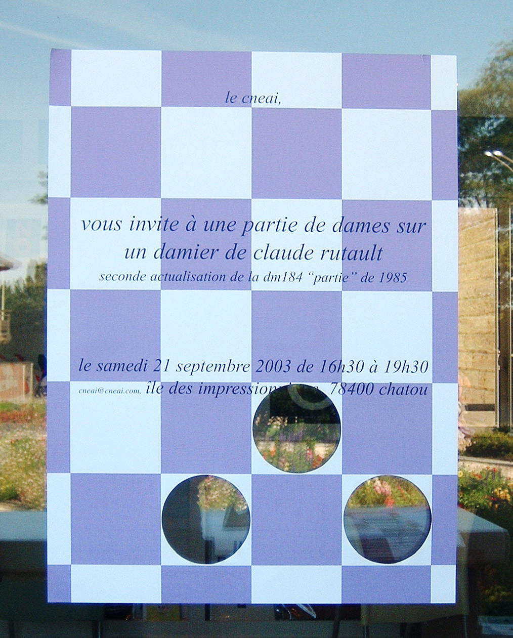 Affiches d’invitation à une partie de jeu de dames sur un damier de l’artiste commandée par le Cneai pour les tournois et l’exposition Partie de dames (d/m184) à Pantin.