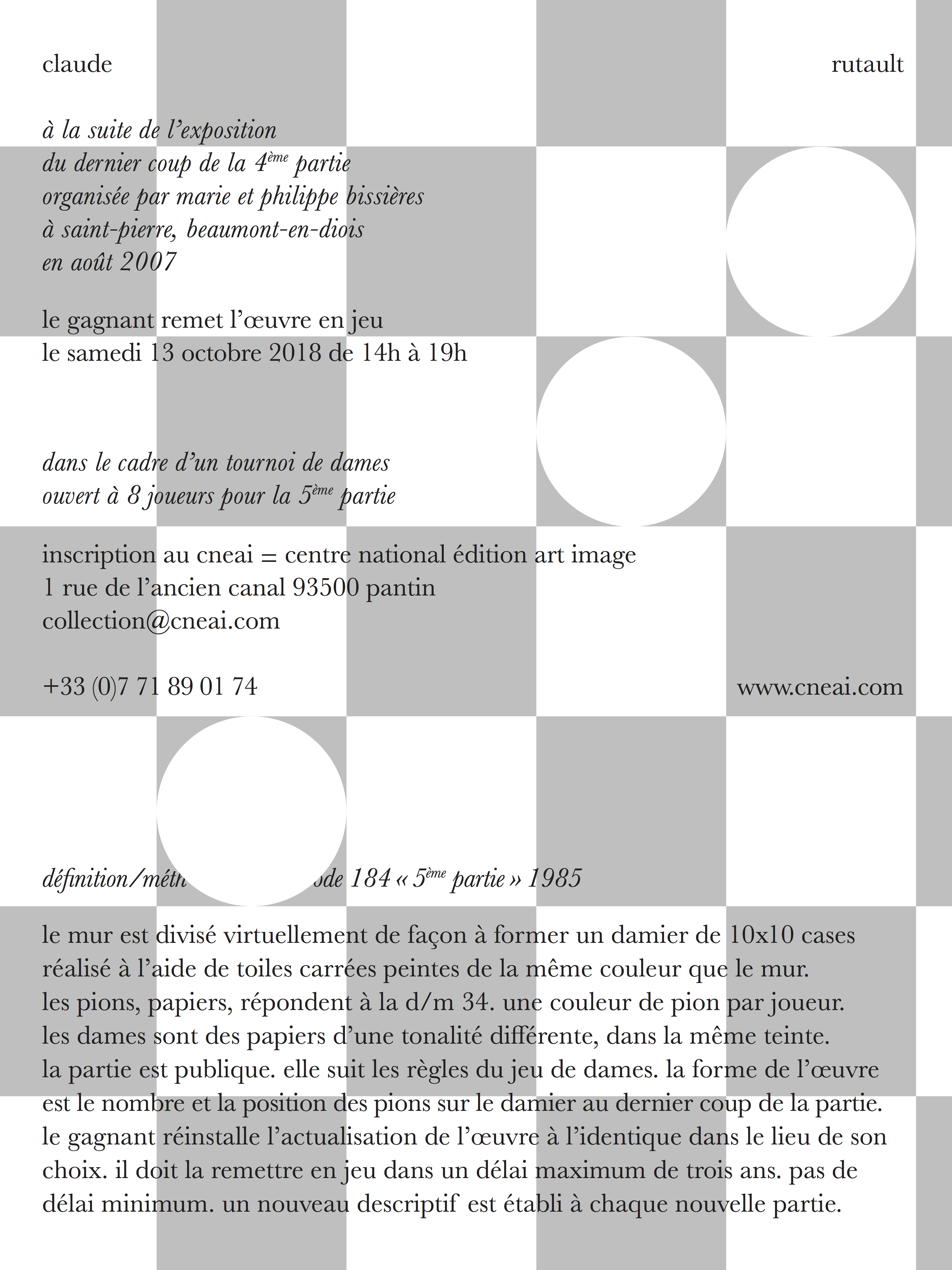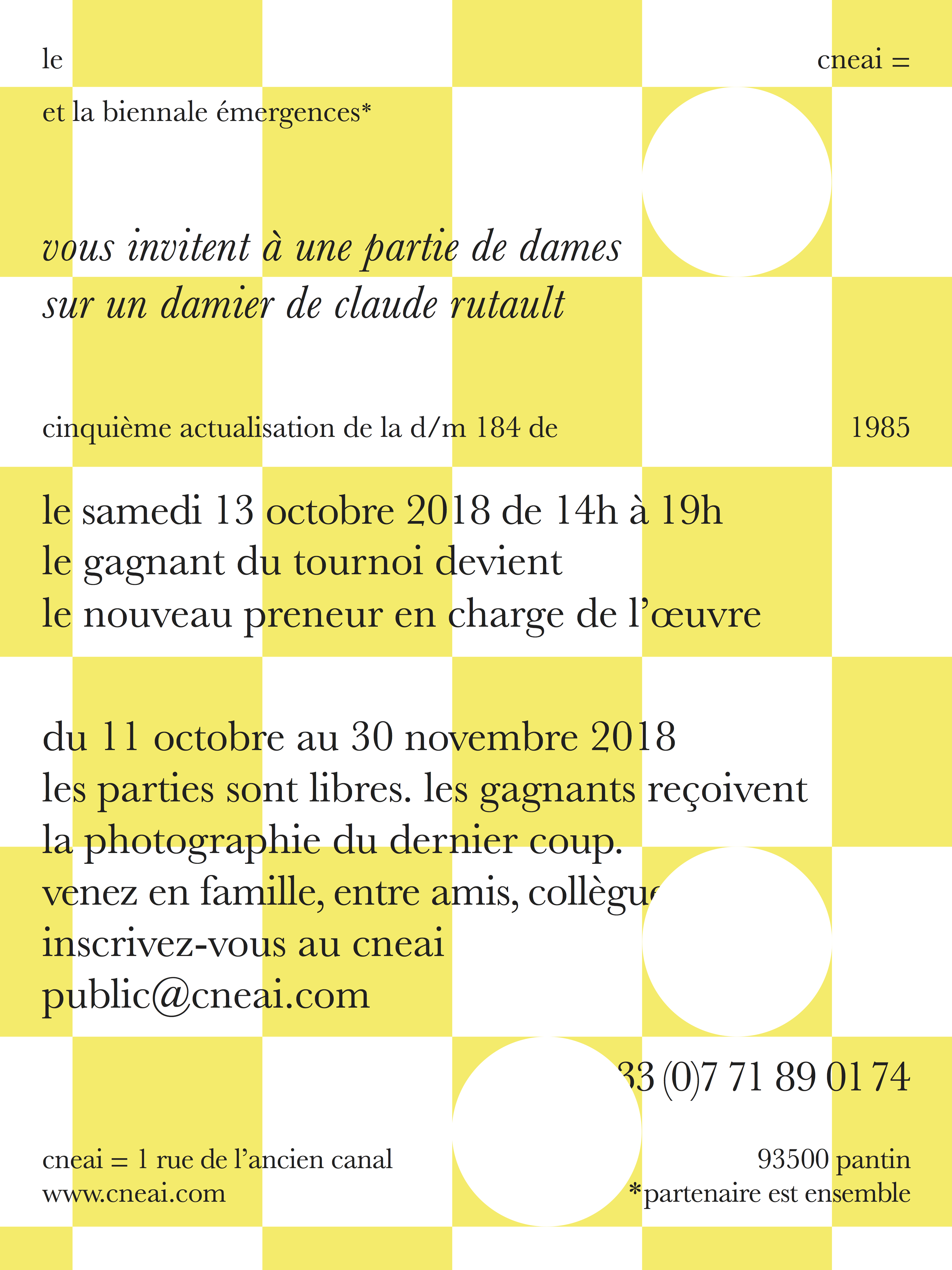Du 11 oct. au 30 nov. 2018 PantinLa Biennale Emergences invite le Cneai à produire une œuvre de l’artiste Claude Rutault sous la forme d’un « Jeu de Dames » monumental, installé au mur. On y joue debout. Des visites et des tournois ouverts sont organisés à partir du 11 octobre 2018.
