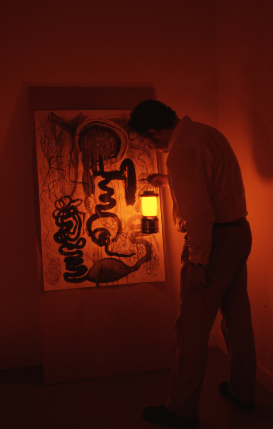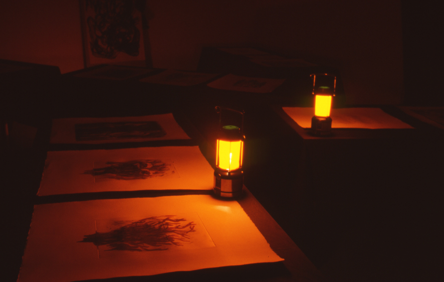 Cameron Jamie a souhaité, en utilisant au Cneai des techniques et des matériaux obsolètes en regard d’une modernité numérique, pratiquer un medium nouveau. En collaboration avec un graveur professionnel, il réalise ainsi un ensemble de plus d’une quarantaine de gravures. Partant du principe que la gravure est une technique de reproduction fidèle mais qui ne permet pas l’identique, Cameron Jamie a choisi de pousser ce potentiel à l’extrême, en décidant d’intervenir sur la matrice entre chaque tirage, en se focalisant sur les erreurs. Des transformations se succèdent qui font que la dernière gravure est la somme de toutes les précédentes. Tel est le procédé et le protocole mis en place par l’artiste. Si l’opinion générale veut que l’on s’améliore avec le temps, Cameron Jamie, lui au contraire, accuse les erreurs au fur et à mesure et les accentue encore. La technique ne s’améliore pas et l’image devient elle-même de plus en plus terrifiante. Cette mise en avant de l’échec et du geste mettent en perspective le parti pris de l’artiste, qui, bien que né à la fin des années soixante, refuse de voir dans la technologie une optimisation de la vie.