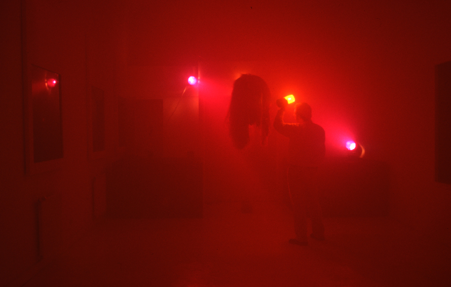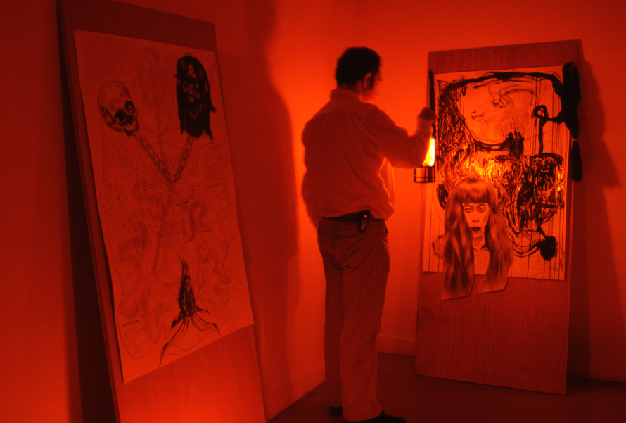 La peur du lieu inconnu se présente avant tout comme une installation sensorielle, une véritable expérience pour le visiteur. Entre train fantôme et maison des horreurs, le Cneai plongé dans l’obscurité, ne dévoilera les œuvres qu’au moyen de lampes torches. Loin de vouloir donner à la culture populaire ou à la contre-culture des codes qui ne sont pas les leur, Cameron Jamie propose de mettre en avant leur esthétique propre.