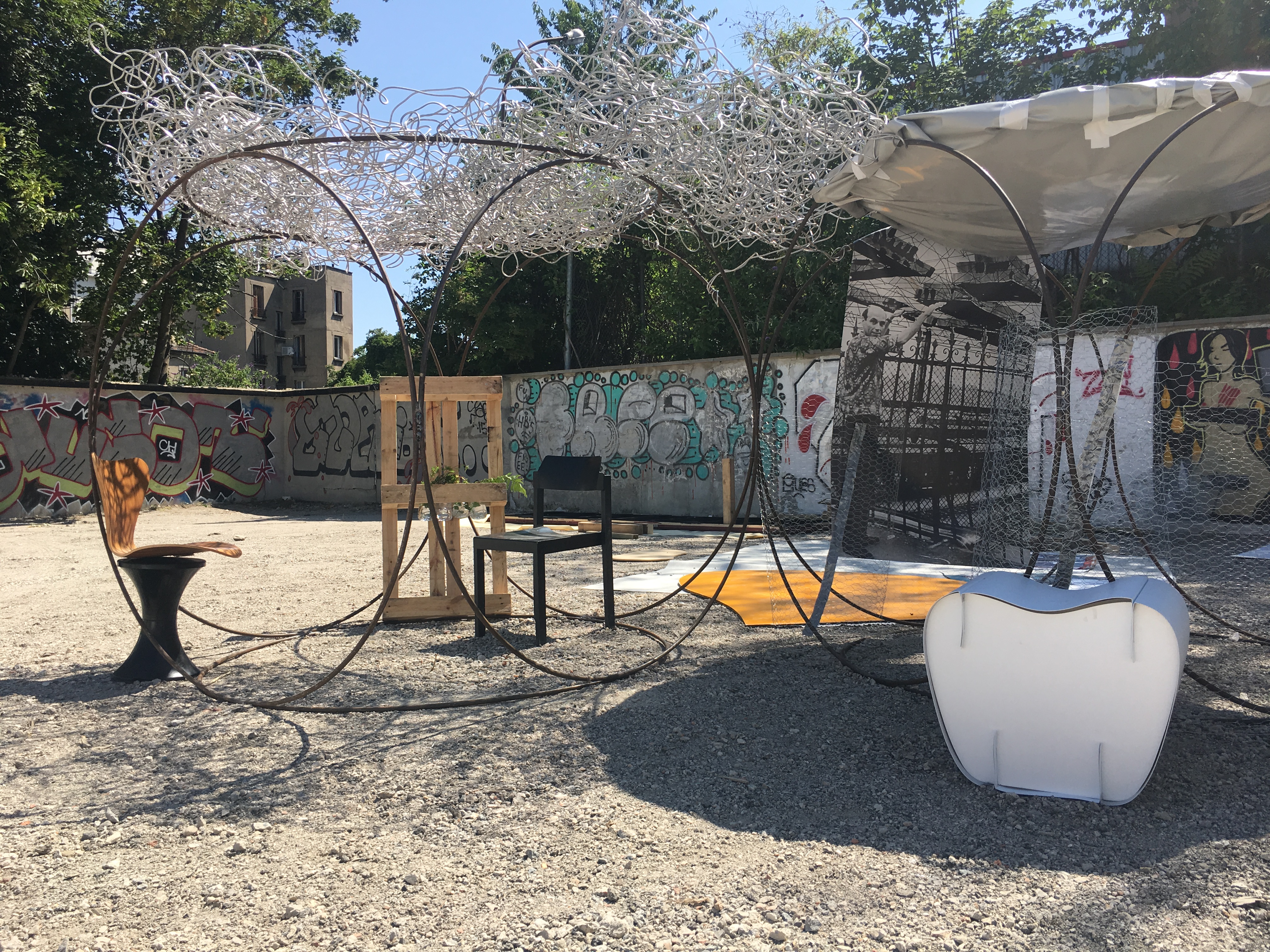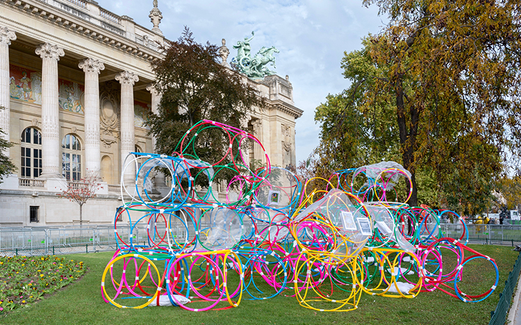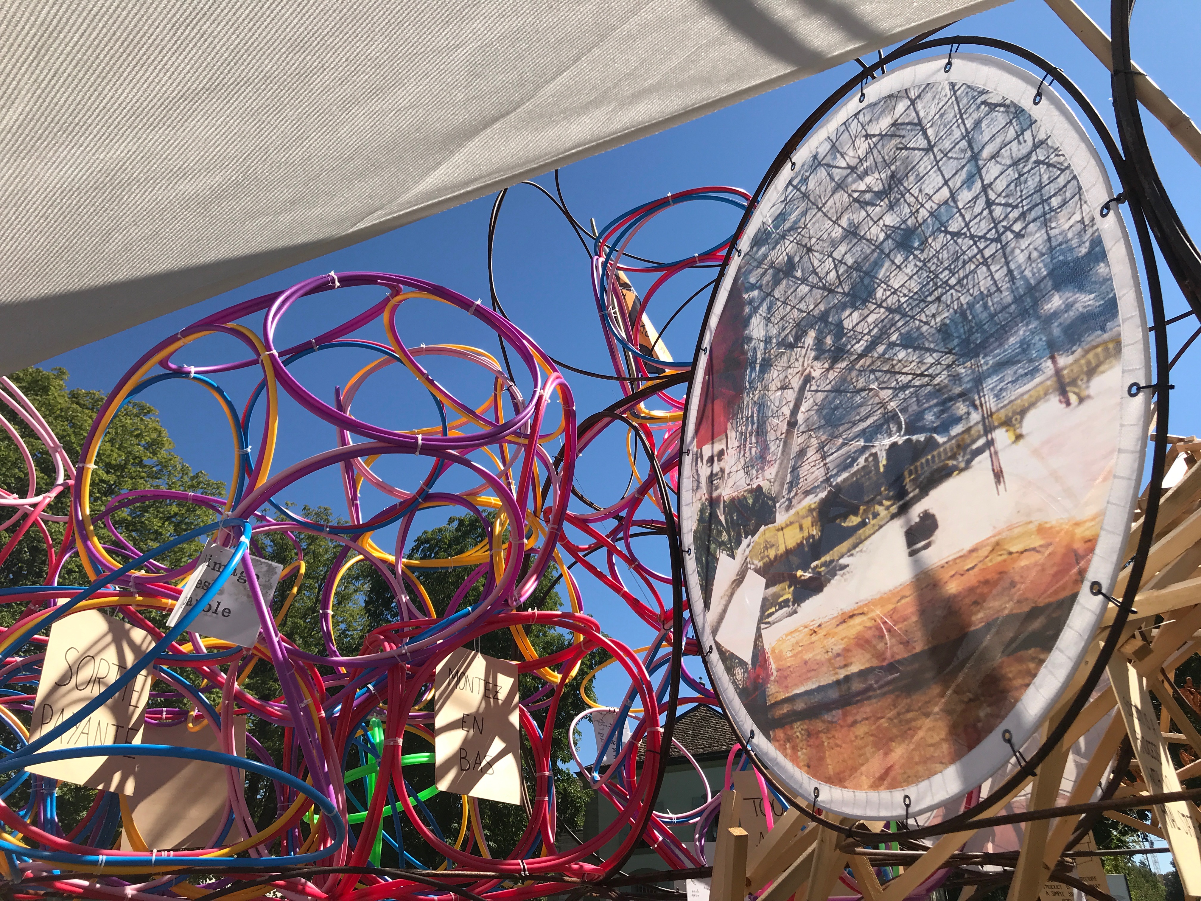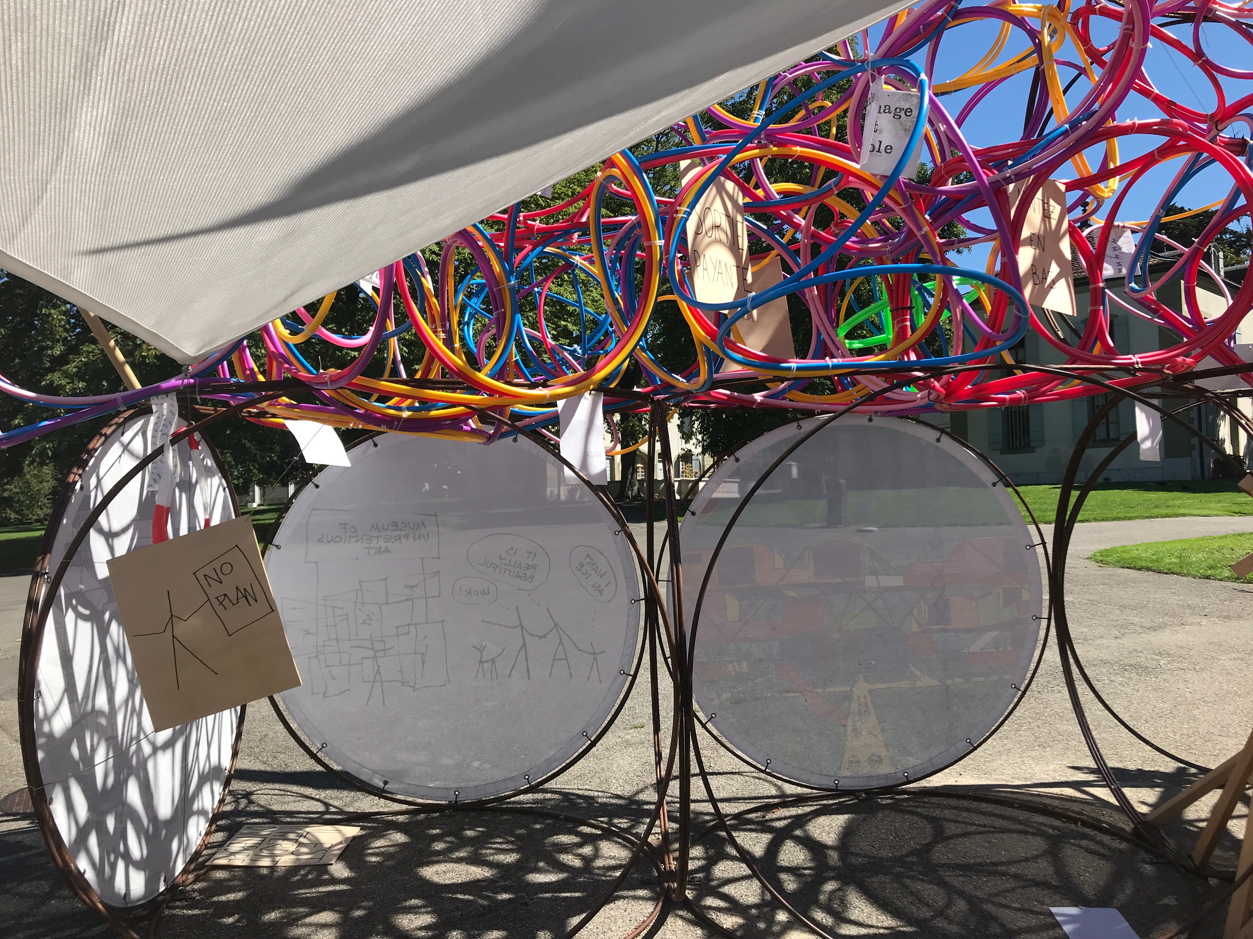Le Musée Sans Bâtiment, réalisé par Yona Friedman, consiste en une vingtaine de cubes, conçus à l’aide de cerceaux en acier de grande taille - 185 cm de diamètre - disposés librement sur le terrain. « Ils servent de support aux œuvres d’art réalisées à partir d’emballages ou d’autres objets : œuvres graphiques, collages, photographies ou graffitis en partie réalisés par le public. » — Yona Friedman
