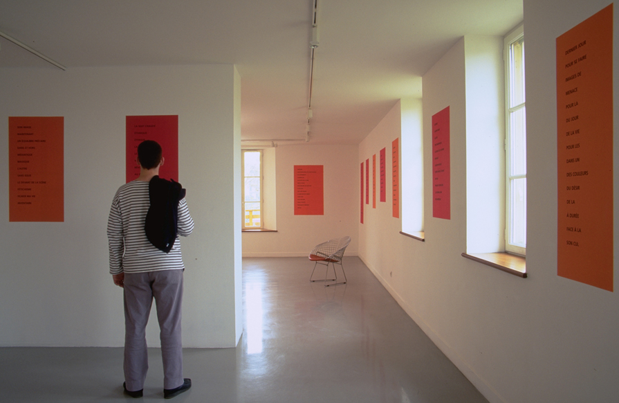 Le double impact de l’image graphique des mots et du message est ainsi l'objet des soixante-seize affiches qui constituent l'exposition. Textes noirs sur fond rouge ou orange, aux dimensions variables, elles reflète un univers contemporain déconstruit.