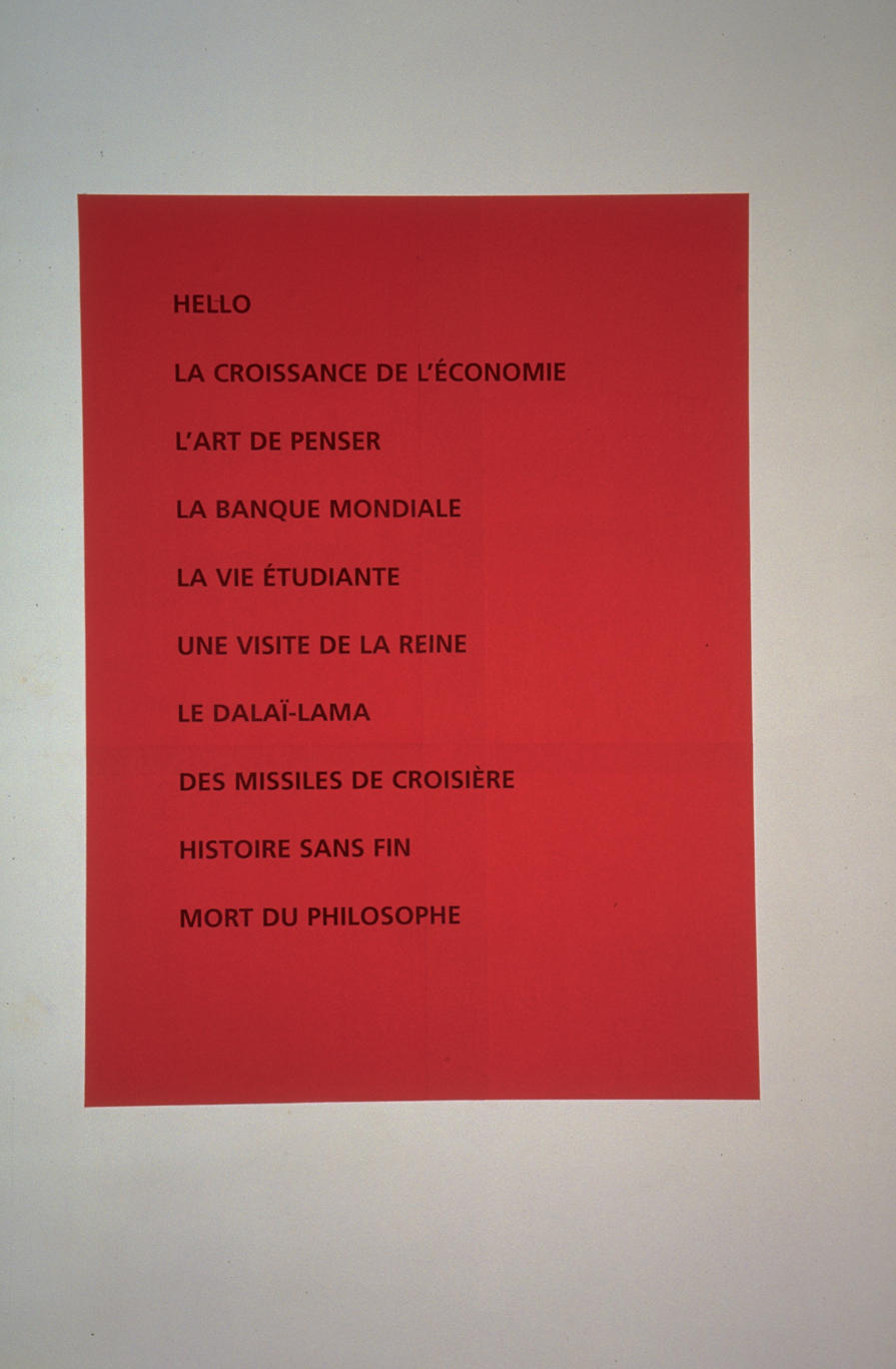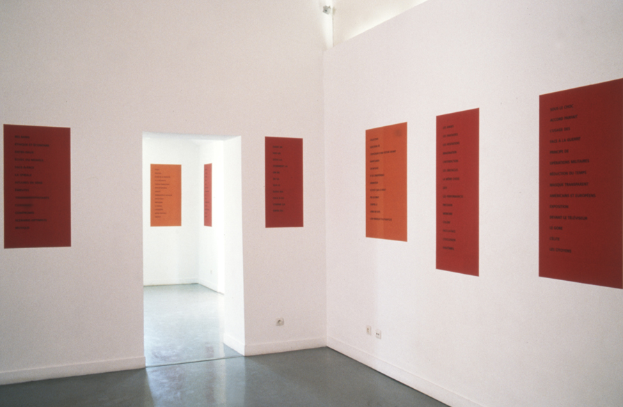 L'énumération longue et particulièrement ennuyeuse de mots et de groupes de mots prélevés au fil des semaines, issus des titres et sous-titres des quotidiens Le monde et Libération, et retranscrits dans une même police de caractère neutre constitue l'unique matériau, à la fois textuel, visuel et sémantique, de l'exposition.