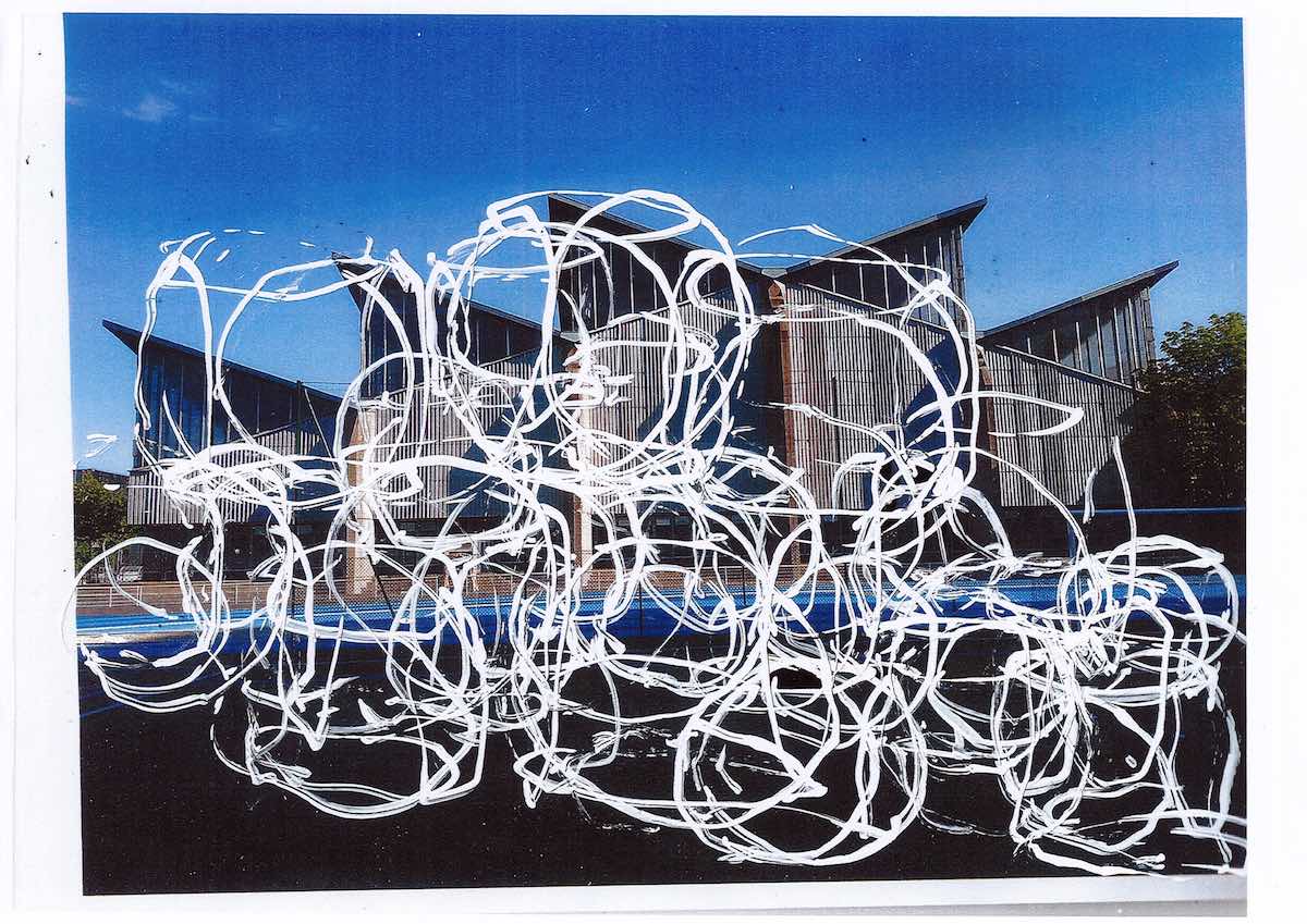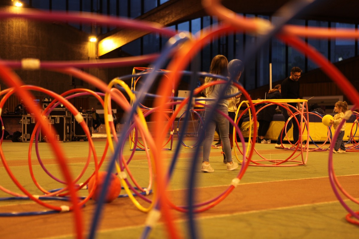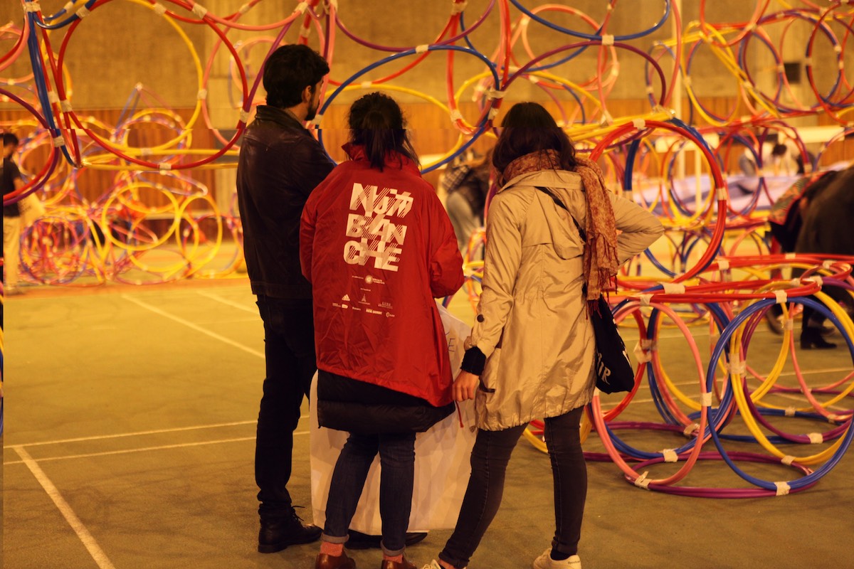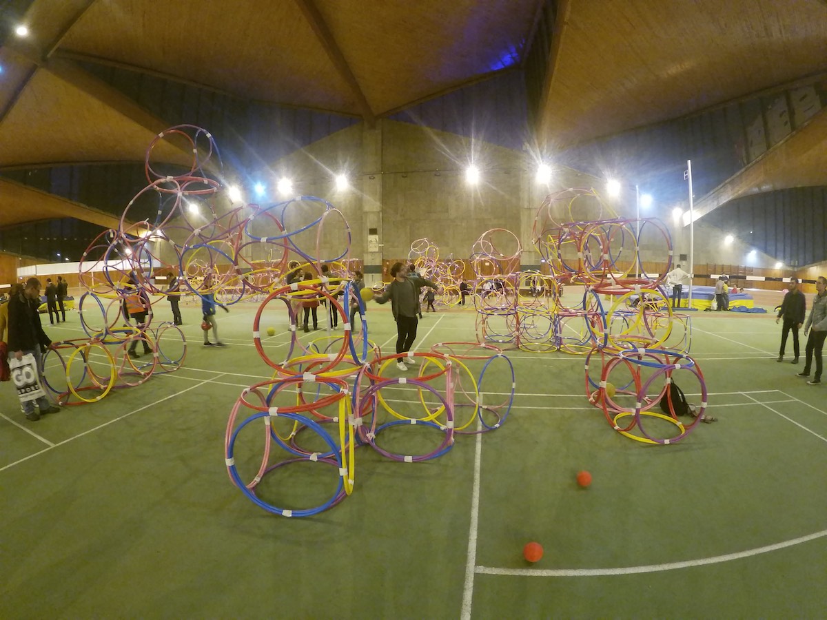 Depuis les années 1960, ces architectures modulaires, ou Space Chains, peuvent se développer à l’infini, selon un protocole souple d’improvisation. Réalisée par l’architecte et humaniste Yona Friedman, la structure inédite du Musée Sans Bâtiment conçue pour la Nuit Blanche 2019 dans sa version « iconostase » consiste en l’assemblage participatif de 800 cercles de hula hoops, disposés sous forme de modules, au sein de la magnifique pagode du Centre Sportif Jules Ladoumègue à Paris.