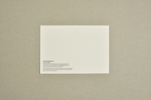 Retrait de l'ensemble des objets accumulés dans la reconstitution du Plein d'Arman (1960-1994) dans le cadre de l'exposition Bien Amicalement. Carte postale éditée à l'occasion de l'exposition Bien amicalement à Blois au Musée de l'objet, 2007.Des objets de rebut remplissent la Galerie Iris Clert en réponse au Vide d'Yves Klein réalisé en 1958 dans la même galerie. Carte postale éditée à l'occasion de l'exposition Bien amicalement à Blois au Musée de l'objet, 2007.