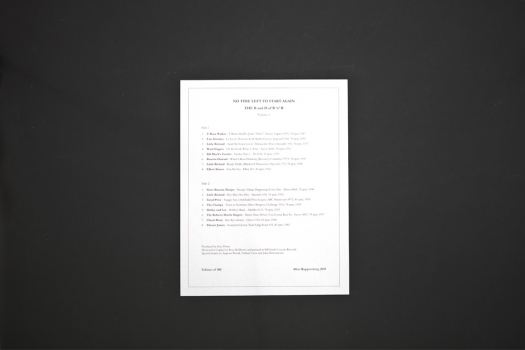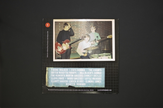 No Time Left to Start Again/The B and D of R ’n’ R, is a sweeping survey of American vernacular recorded music from blues singers of the early 1900s through guitarists of the 1960s. Ruppersberg has compiled a history of folk, gospel, blues, and rock by scanning and laminating three kinds of source material: covers for vinyl records, amateur snapshots taken at music events, and obituaries for musicians.