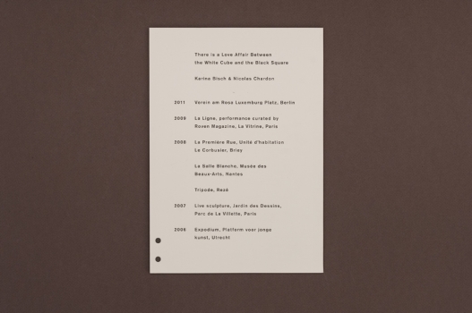 There is a Love Affair Between the White Cube and the Black Square compile tous les projets réalisés à ce jour par le duo d'artistes Karina Bisch et Nicolas Chardon.