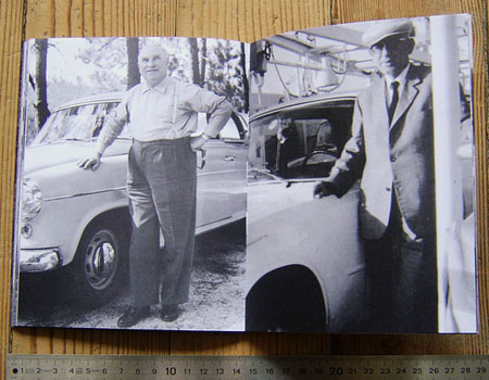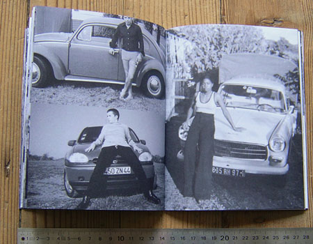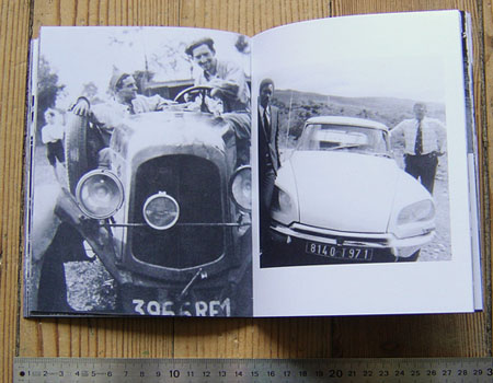 Assemblage de photographies de famille représentant des "gens qui pensent? à côté de leur voiture, classées par âge.