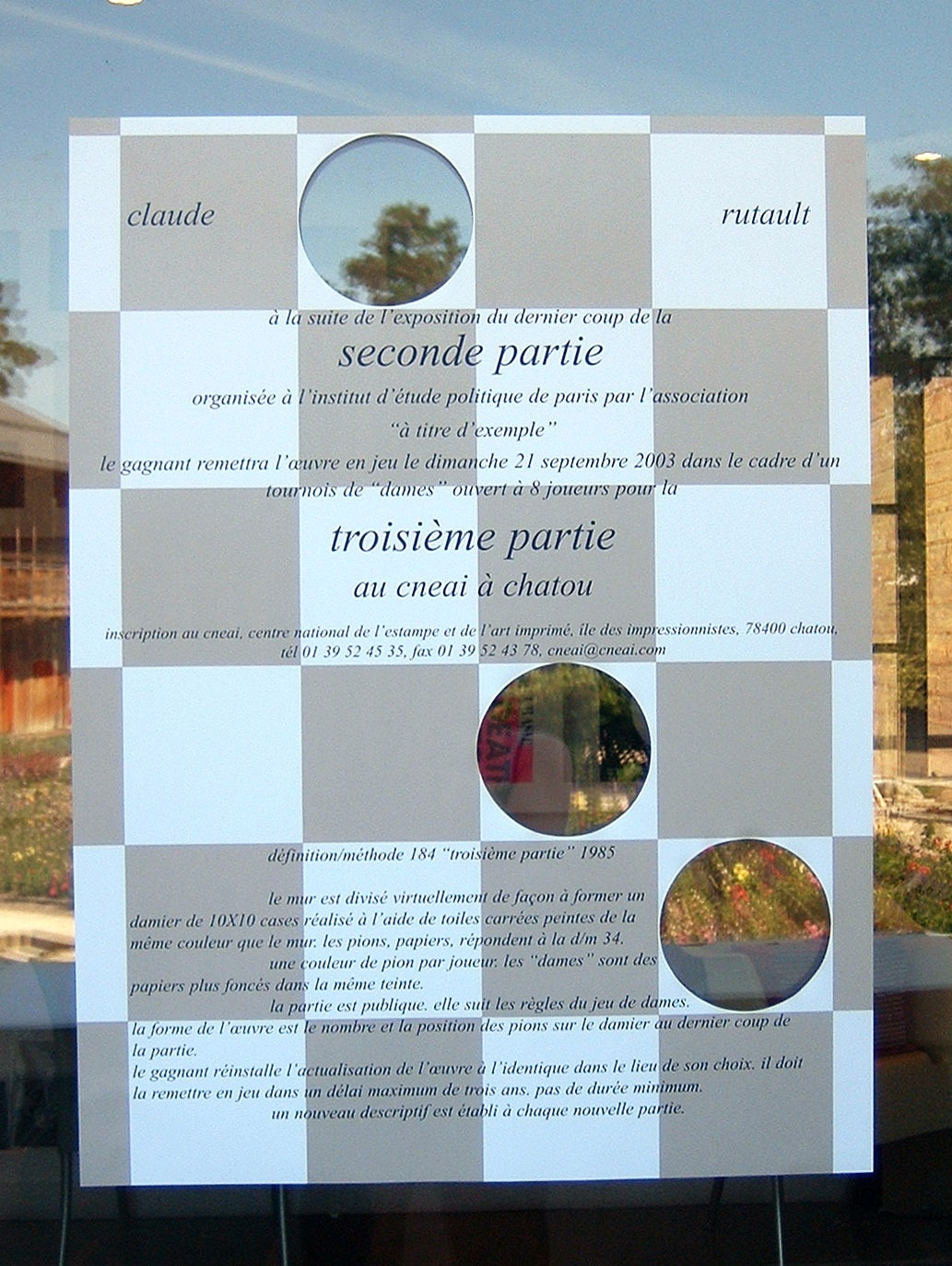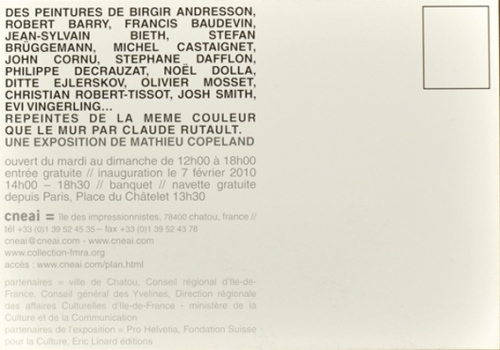 Avec des œuvres de François Aubart, Fia Backström, James Lee Byars, Continuous Project, Koenraad Dedobbeleer, Documentation Céline Duval, Pascal Doury, Peter Downsbrough, Antoine Duchenet, Jacob Fabricius, Jef Geys, Nicolas Giraud, Thomas Hirschhorn, Karl Holmqvist, Manuel Joseph, David Jourdan, Ben Kinmont, Alison Knowles, Ferdinand Kriwet, Lefevre Jean-Claude, Christophe Lemaitre, M/M (Paris), Clara Meister, Aleksandra Mir, Vera Molnár, Antoni Muntadas, Camille Pageard, Aurélie Pétrel, Seth Price, Conny Purtill, Lee Ranaldo, Allen Ruppersberg, Claude Rutault, Yann Sérandour, Leah Singer, Tatiana Trouvé, Julie Vayssière, et al.